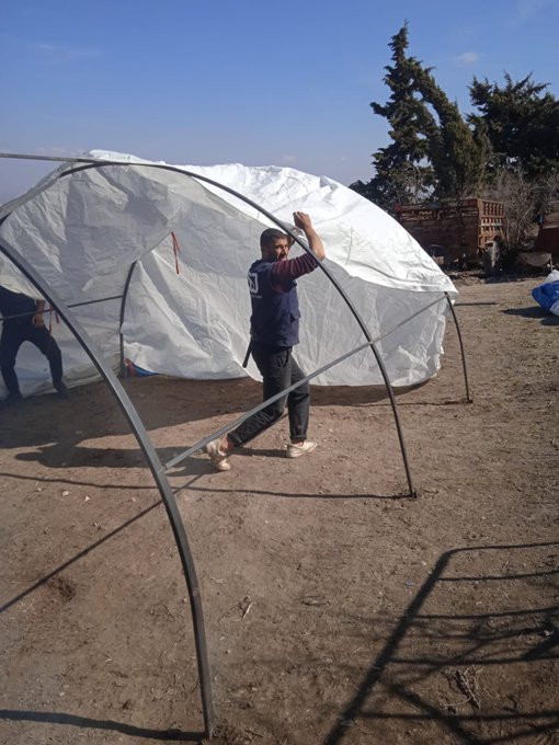 上述したように被災地では多くの建物が全壊してしまい、人が住めるような状態ではなくなってしまいました。そのため地震発生直後、被災者の方々は路上に着の身着のままの状態で避難生活を送り、氷点下を迎えるシリアの冬の中、凍えながら支援を待っていました。この状況にいち早く対応すべく、SSJでは皆様からの義援金が届く前から資金備蓄をすべて緊急支援に回し、現地にてテントを購入・配布・設置までを行いました。皆様からの義援金が続々と届いてからはさらに現地スタッフを動員、配布する数も増加させ、被災者の方々に少しでも安らぎの場を与えられるよう、支援を届けています。まだ余震が現地では続いているため、倒壊した建物が多くある街の中心部から少し離れた場所にテントを設置しています。写真3 ©︎Stand with Syria Japan