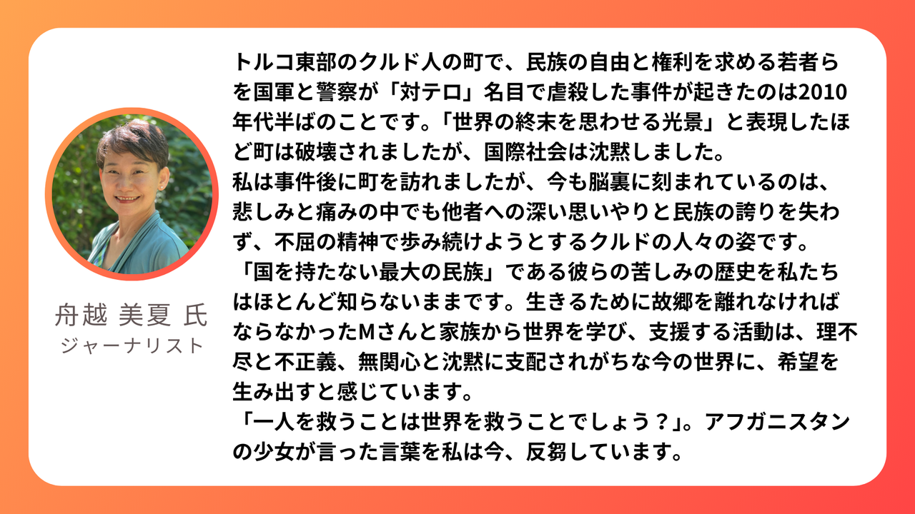 私たちは、Mさん家族が日本で安心して暮らしていけるよう支援を続けるとともに、難民として保護されるべき人が保護されるよう、日本の入管法の問題点やクルド難民についての理解促進のための活動も継続して行います。そのための活動費、およびMさん家族の生活費のご寄付なども必要としています。マンスリーサポーターとして応援も可能です。今後もぜひご支援をよろしくお願いいたします。
