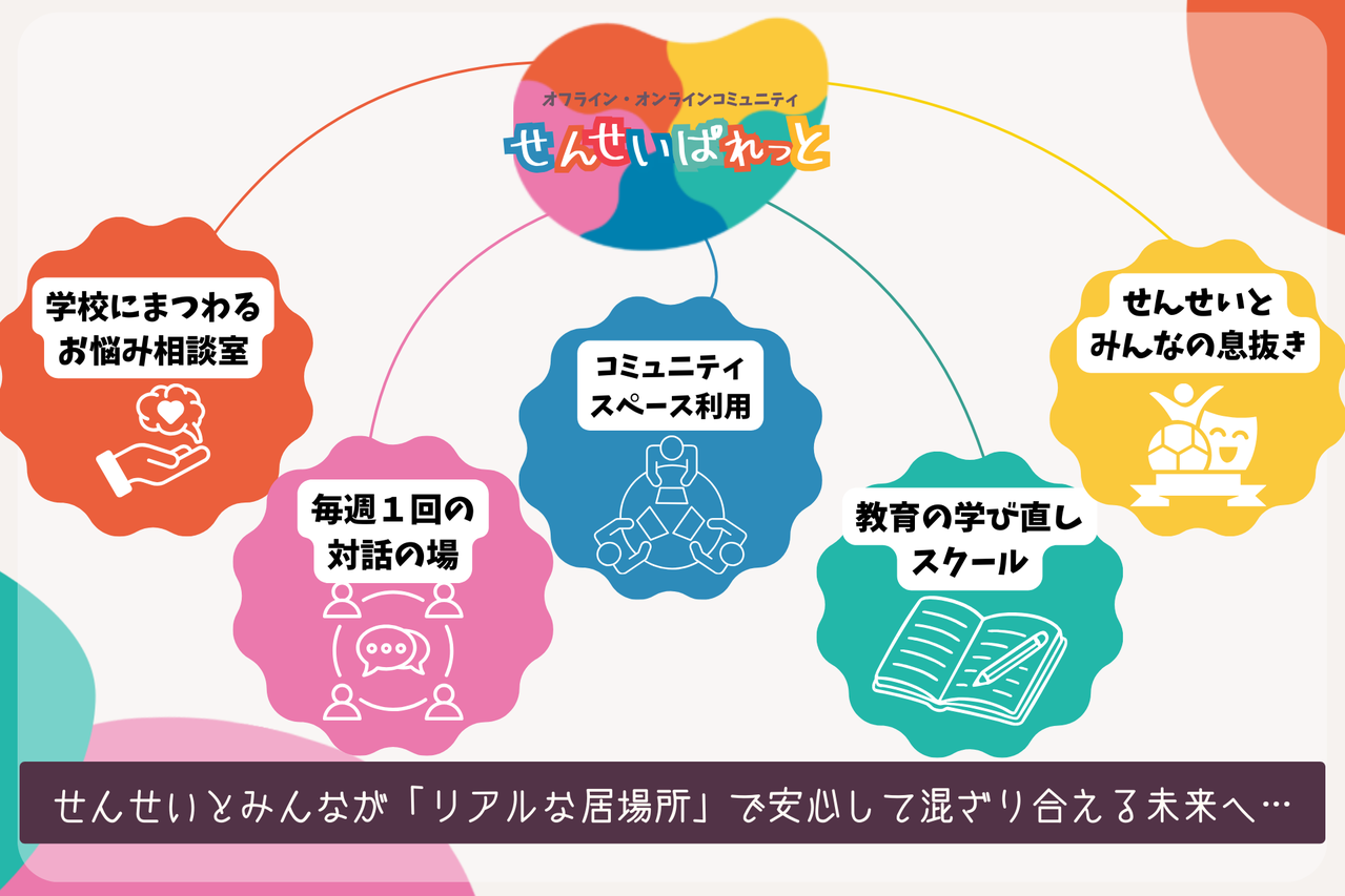 そこで今回、地域を超えて人が集い、これまでまなびぱれっとで運営してきたコミュニティを含むオンラインとオフラインが混ざり合う新しいコミュニティとして「せんせいぱれっと」を立ち上げます。