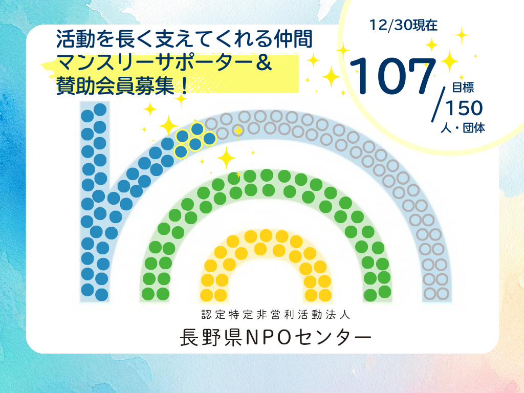 12/30現在で、マンスリーサポーター+賛助会員、107人となりました! ありがとうございます!!