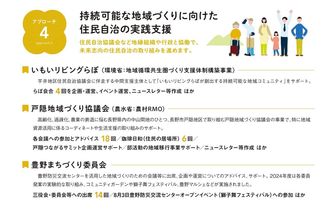すでにご紹介した災害支援事業、就労準備支援事業の他に、持続可能な地域づくりに向けた実践支援、NPO広報発信(ナガクル)、SDGsの推進、他団体との協働、ソーシャルビジネスサポートながの、市民活動の団体支援などの取組みも、他事業所のメンバーと連携しながら主に高田事務所で担っています。