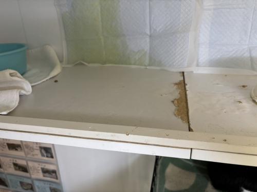 また、JFEレスキューの猫たちが暮らすお部屋では、保護頭数が多く、劣悪な環境からレスキューされた子も多いため、トイレの習慣がなかなか身につかない子もおり、棚にアンモニア臭が染みついてしまっています。