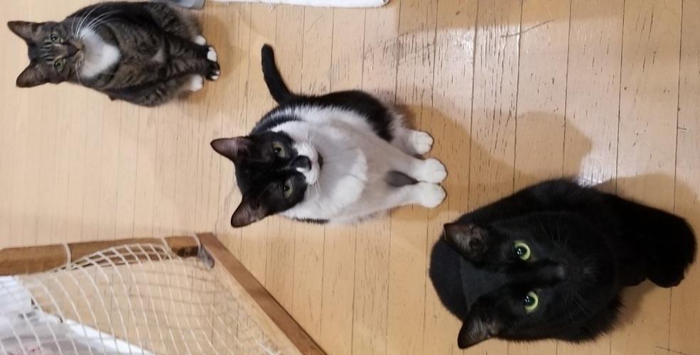 調子が悪くならないか気にかけていたら、キッチン入口に、かんた、ロク、ポルカが来て並び、たぶんおやつが欲しくて私に訴えているんだと思いました。