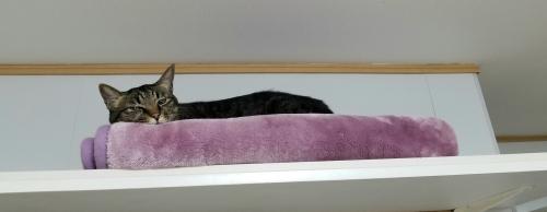 運動神経も抜群で、棚に楽々ぴょんと乗り、棚から棚へ軽快に移動します。