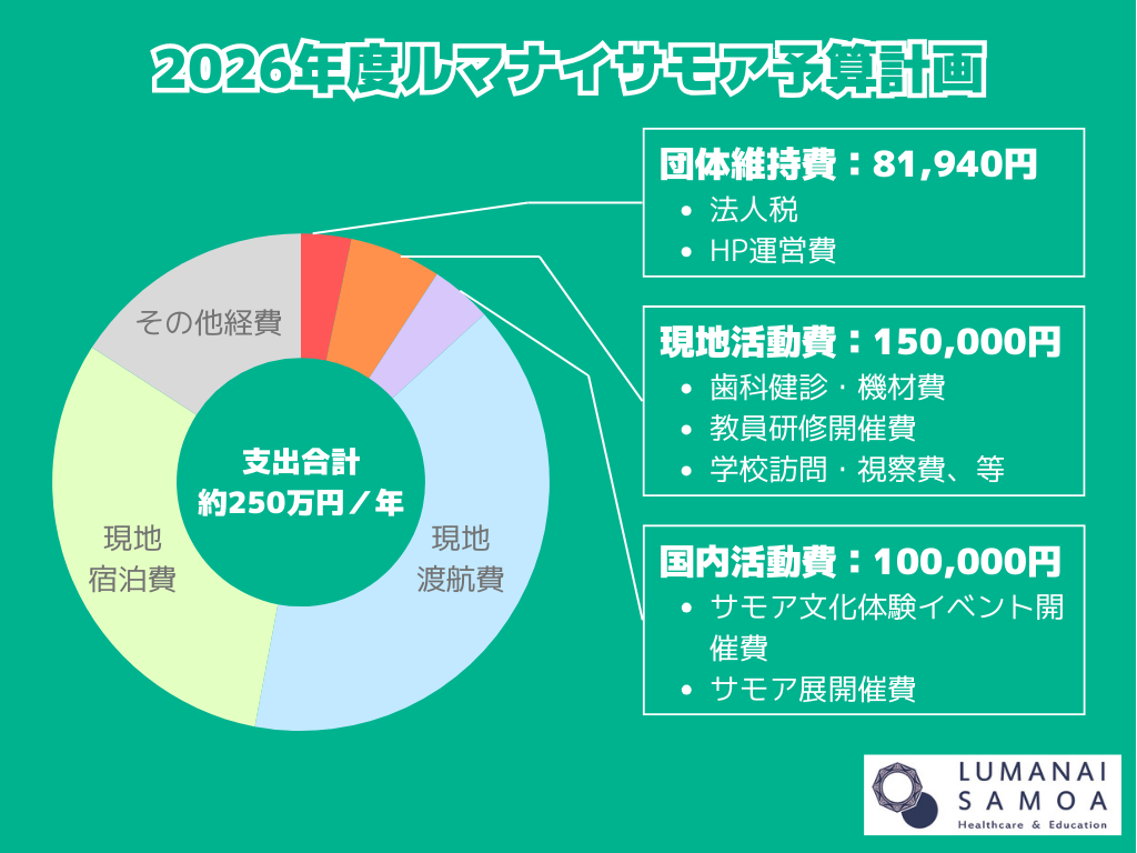 現在、団体の運営には最低でも約250万円の予算が必要であり、今後活動を拡大していくためにはさらに大きな金額が必要となっていきます(2026年度の予算計画の内訳は下図の通り)。