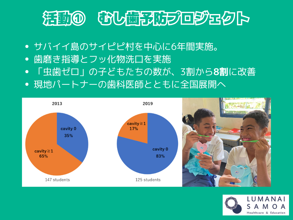 医療では、歯科医師のメンバーを中心に「むし歯予防プロジェクト」を実施してきました。サモアで最も医療へのアクセスが悪いサバイイ島のサイピピ村の子どもたちを対象に、歯磨き指導とフッ化物洗口を組み合わせた独自のアプローチで取り組み、むし歯ゼロの子どもの数の割合を3割から8割に改善しました。