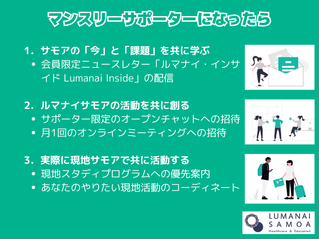 ルマナイサモアではマンスリーサポーターになると、会員限定のニュースレター「ルマナイ・インサイド Lumanai Inside」を定期的に受け取ることができます。