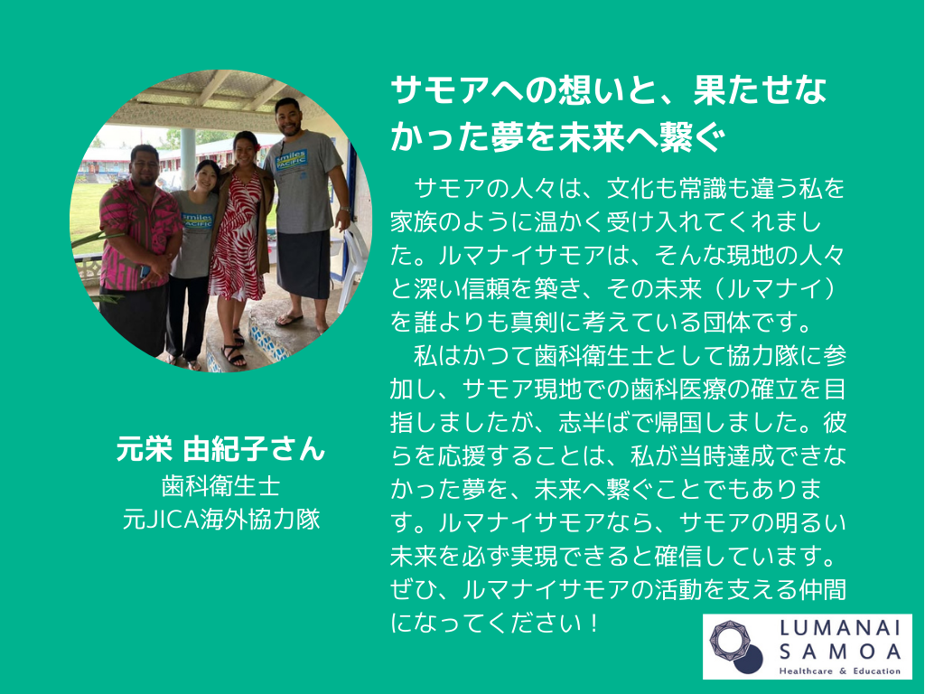 歯科や教育に限らず、あなたの情熱をサモアの未来へ繋ぐ。