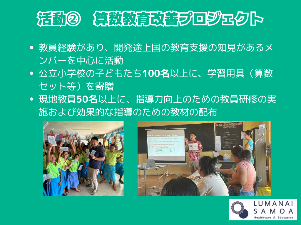 教育では、日本とサモア両方の教育現場を知る元JICA協力隊のメンバーが現地の先生たちとスクラムを組み、サモアで最も低迷している強化の一つである算数の教育改善に取り組んでいます。これまでに、50名以上の現地教員に算数指導の研修を行い、100名以上の子どもたちに算数セット(コンパスや定規)届けてきました。
