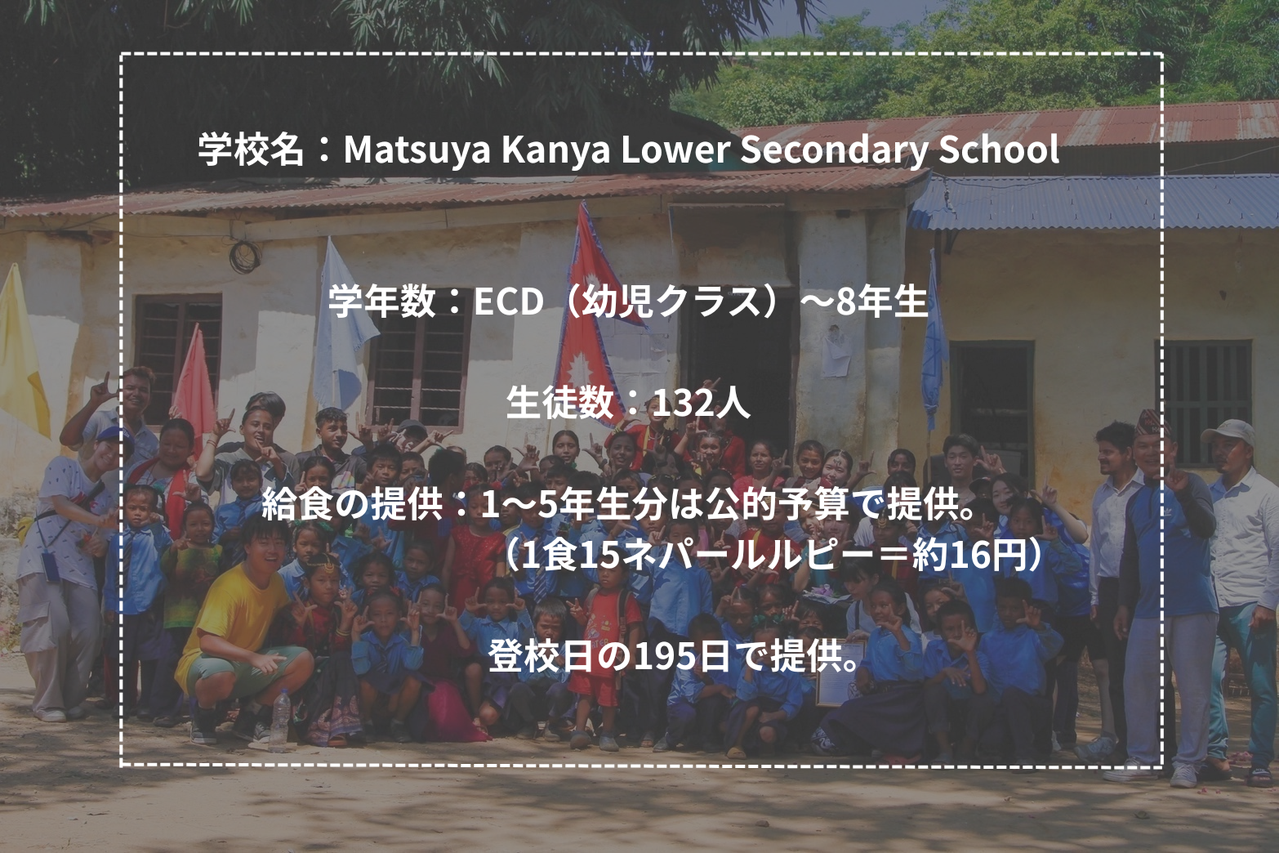 ネパール・タナフ郡ビャス市のMatsuya Kanya Lower Secondary School(以下、マッチャカンヤ学校)の6年生から8年生52人に給食を届けます。