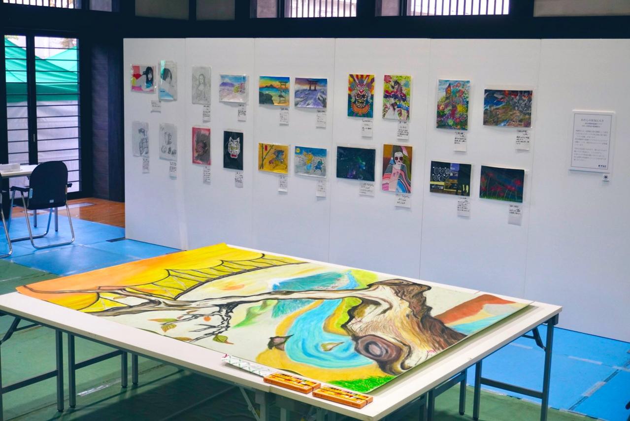 過去3回の刑務所アート展応募作品に加え、府中刑務所内の「絵画クラブ」所属メンバー10人による絵画作品を展示したほか、加えて、今回の文化祭出展に合わせて私たちから企画提案した、初の合同制作・大型の絵画作品も展示しました。