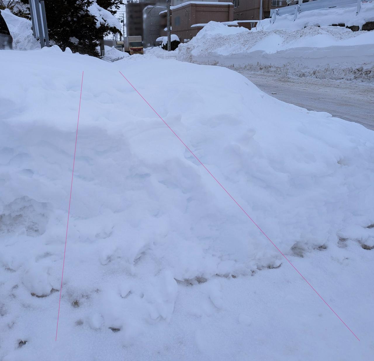 写真:2026年1月末の大雪後、除雪された後、歩道(赤線の位置にある)が埋まっている様子