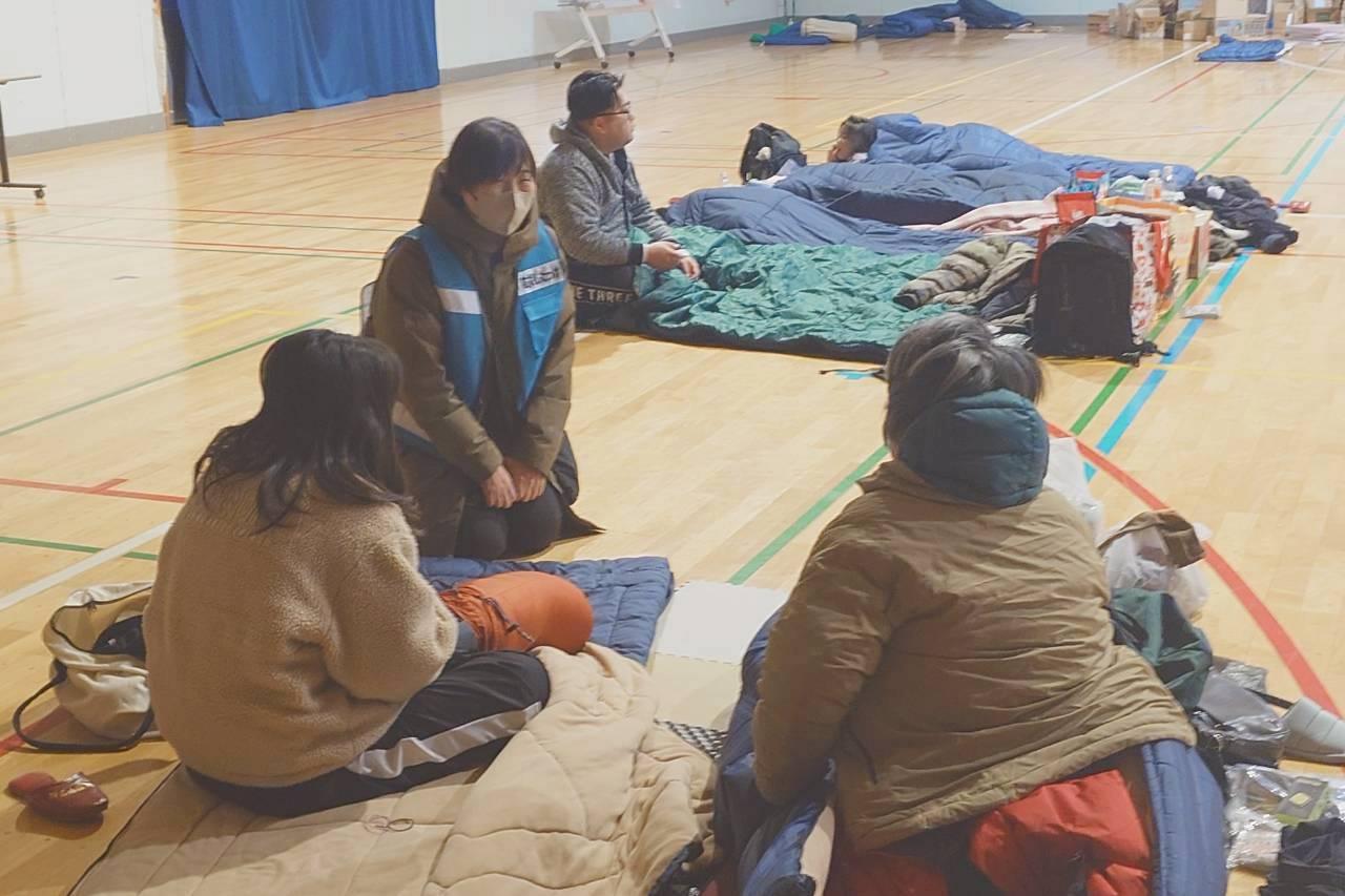 写真:積雪期の避難所宿泊体験。参加者への朝の声掛け