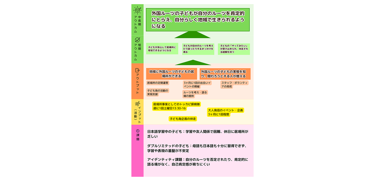 そして、ワークショップという形で、外国をルーツに持つ子どもたちと大人たちとの出会いを重ねるなかで、大人たちも子どもたちとの関わりからなにかを学び、子どもたちにとっては、大人の姿に自分を重ねながら、自分自身の未来を創造していく「小さなきっかけ」になることを願って活動していきます。