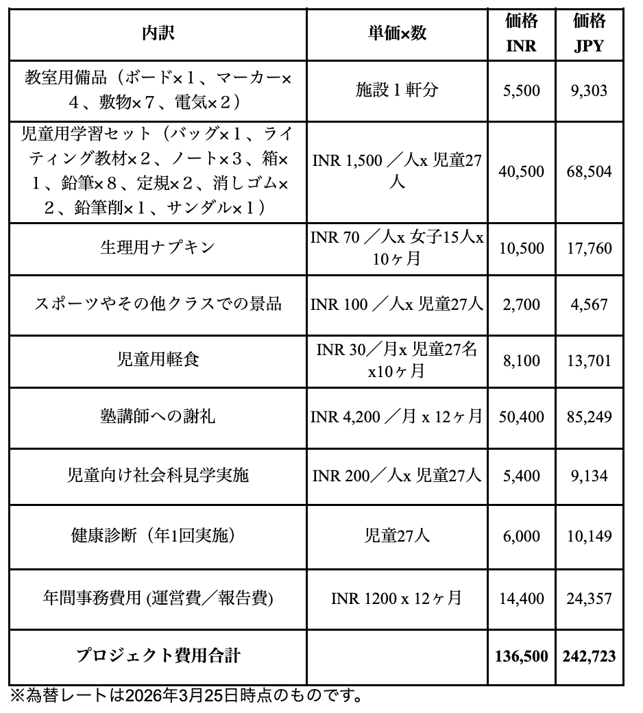 1つの教室(生徒約27名)を1年間運営するために必要な費用は、約25万円。4校すべてを継続させるためには、合計で約100万円が必要です。