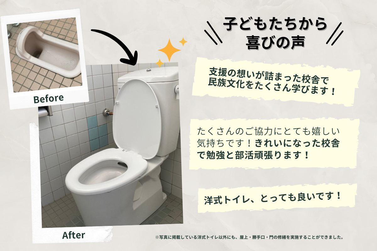 このご支援により、屋上防水補修を進める見通しが立ち、雨漏り等による学習環境の不安を減らす一歩につながりました。あわせて、トイレの洋式化や校門の補修など、日々の学校生活に直結する改善にも取り組むことができました。