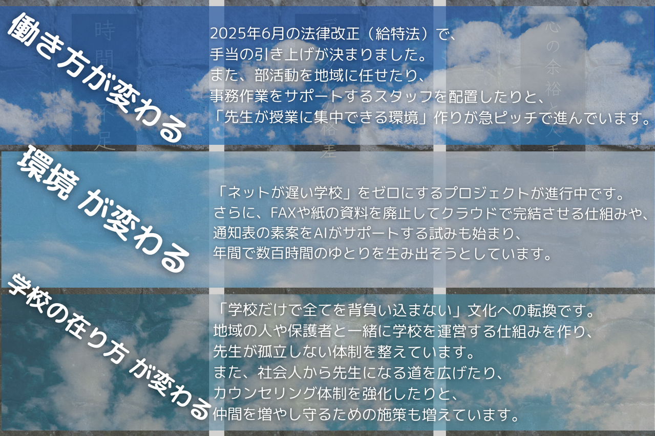 ここまで、実現してきた先生の「やりたい」に目を向けてきましたが、「学校を良くしたい」という想いがあっても、今の現場にはどうしても抗えない3つの大きな壁が立ちはだかっています。